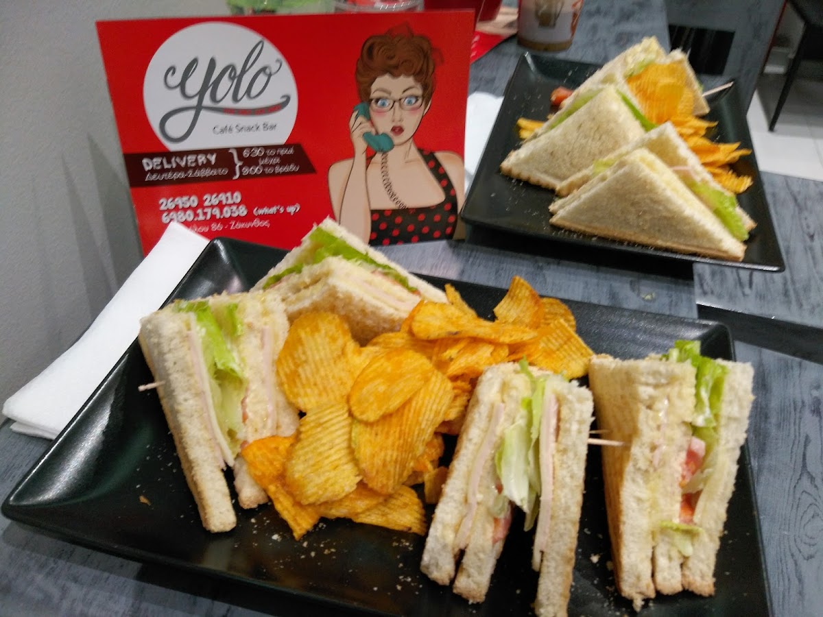 One of the standout dishes at Yolo Cafe is their signature Κλαμπ Σάντουιτσ (Club Sandwich). This deliciously satisfying sandwich is a perfect combination of fresh ingredients stacked high with flavorful meats, crisp vegetables, and savory sauces. Whether you're in the mood for a light snack or a hearty meal, the Κλαμπ Σάντουιτσ is sure to hit the spot. It’s an ideal choice for anyone who wants to indulge in something tasty while enjoying the laid-back atmosphere of this inviting café.